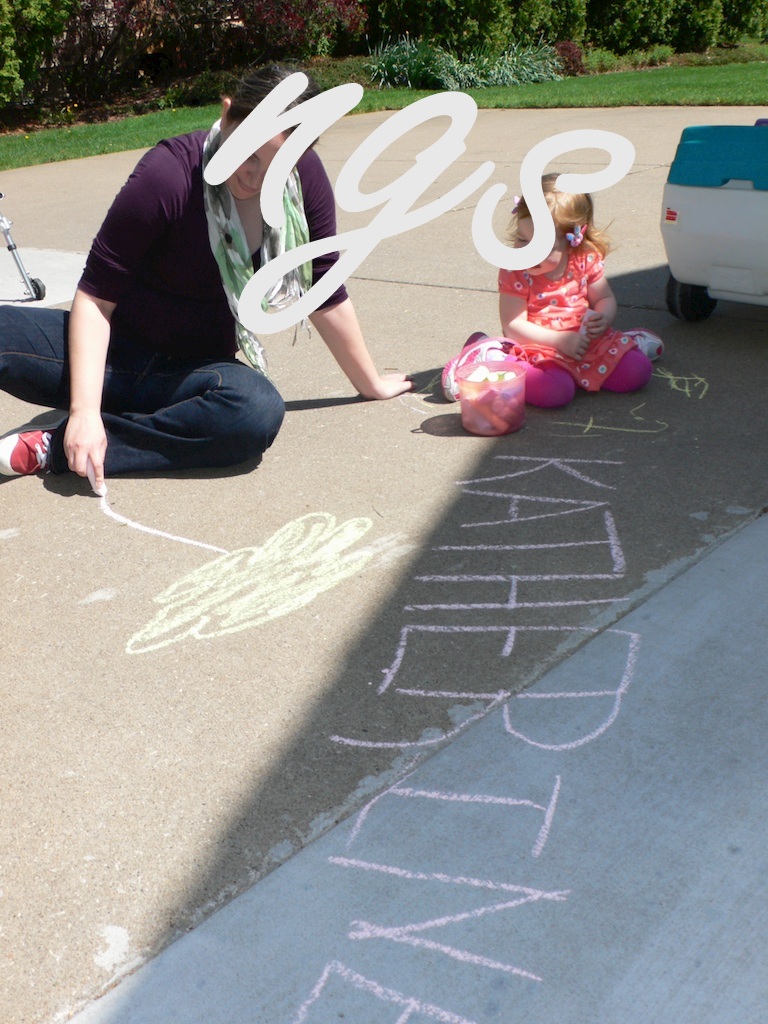 I walk out to the driveway to see the adults clustered around the edge, preventing small feet from meandering into the street, the boys playing ball in the side yard, the oldest girl riding a bike recklessly around the drive, and one small little girl coloring with sidewalk chalk, her walker abandoned next to her. It breaks my heart to see her there all alone. I squat down next to her, tug her hair gently, surprising her with my "what's up, Katydid?" question.